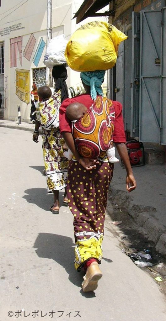 東アフリカの女性たちにとって、カンガは生活の中でなくてはならないもので、赤ちゃんが生まれたときには新品のカンガでおくるみをして、また、女性が亡くなったときには、その亡骸をカンガでくるみます。『揺りかごから墓場まで』という言葉がありますが、まさにカンガは女性の一生をあざやかに彩ります。 また、女性たちは、自分の気持ちや考えを特に主張したいとき、その気持ちにぴったりのカンガセイイングの書かれたカンガを着たり、贈ることでさりげなく自己主張します。
