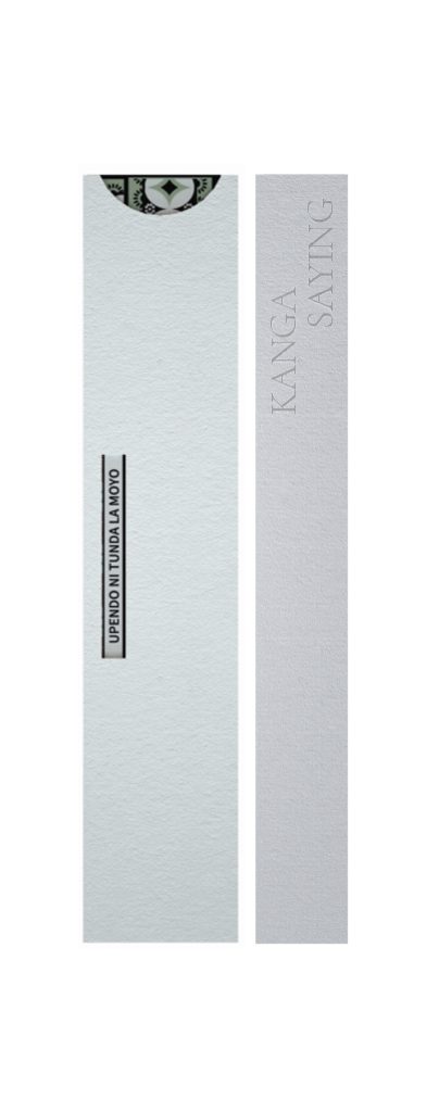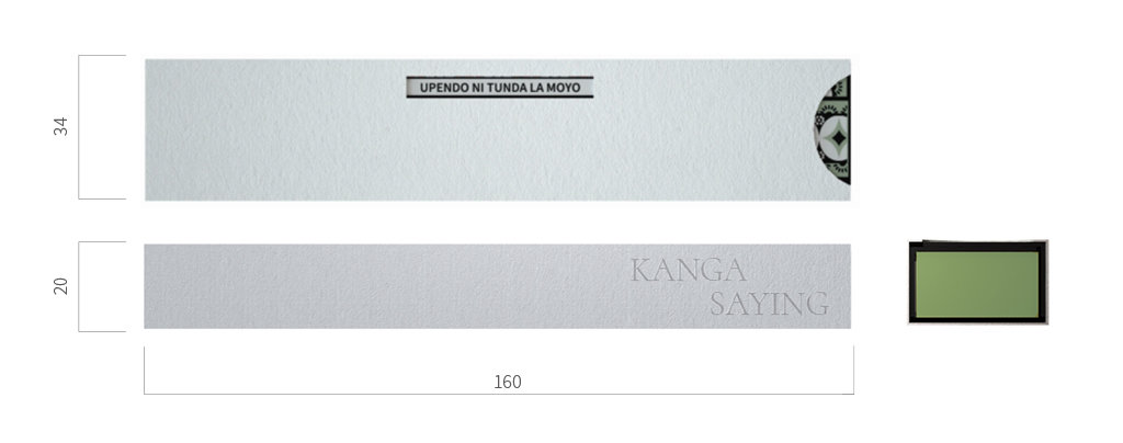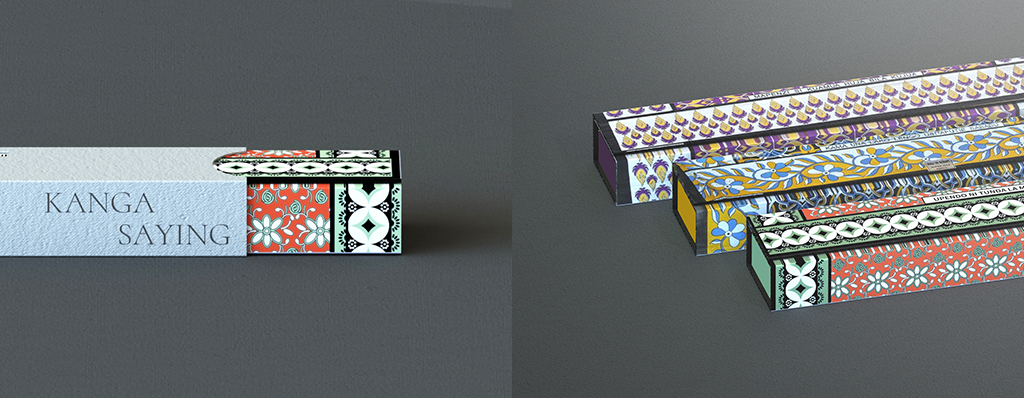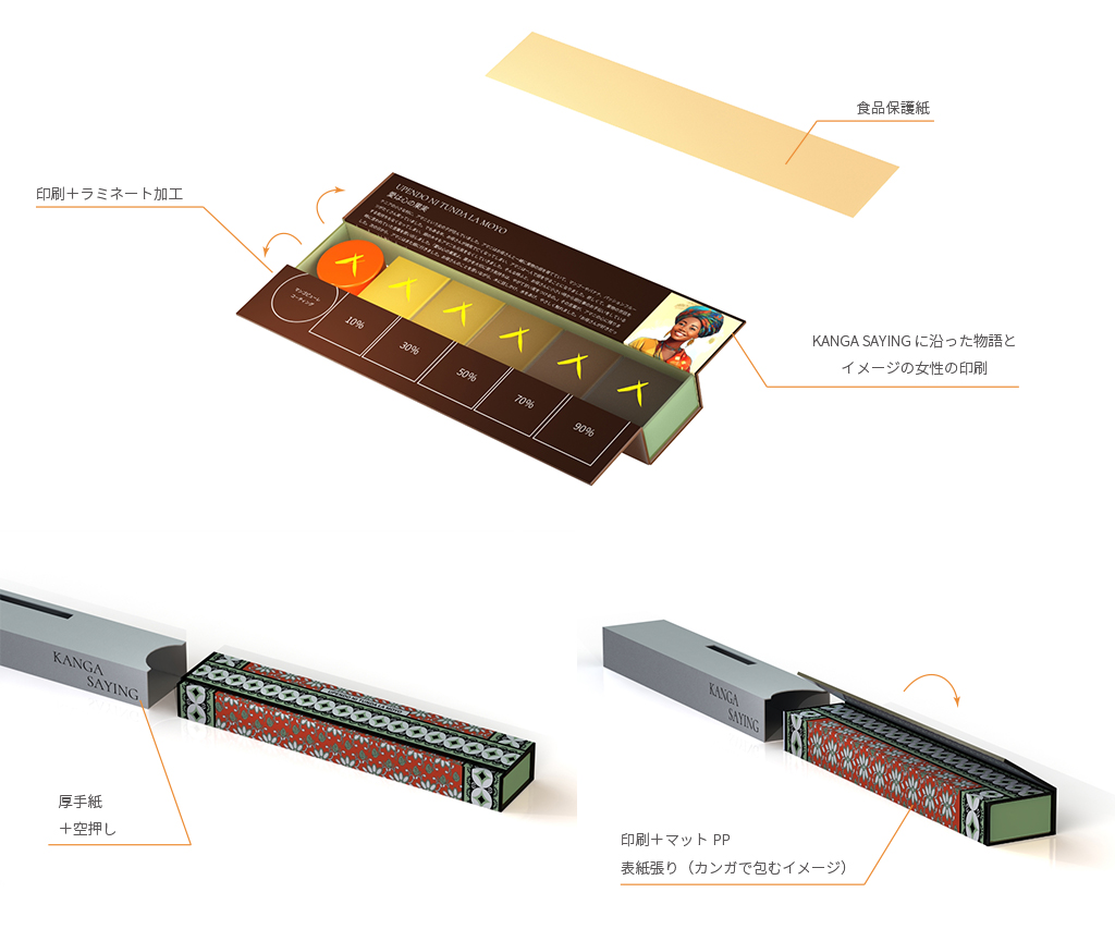 スリーブ(外箱)は3 パターン共通のデザインで、ケニアの夕暮れをイメージした半円の窓から、それぞれのカンガの鮮やかな柄が覗きます。また、KANGA SAYING(メッセージ)もスリーブから見え、購入者はチョコレートの味だけでなく、そこに込められたメッセージも合わせて贈る人や自分自身への想いをのせる事ができます。