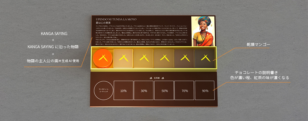 スリーブを開けると、表紙貼りのカンガが折り畳まれたようなデザインになっており、開くと蓋裏には「KANGA SAYING」に沿ったちょっとした物語が現れ、チョコと一緒に楽しむことができます。