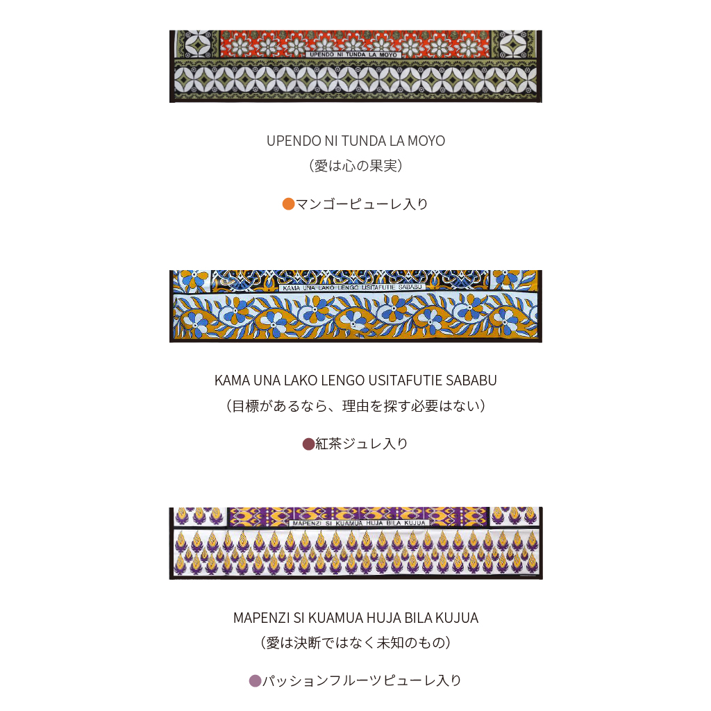 中には、KANGA SAYING からインスパイアされたケニア名産のものを使用したフレーバーのピューレ入り。